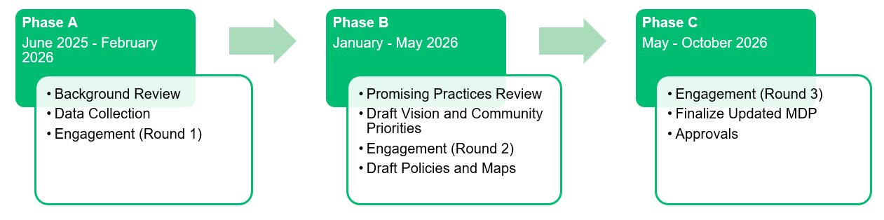 We are updating the Town's Municipal Development Plan (MDP) to address issues and trends that have emerged since it was last updated in 2016, and to make sure it aligns with recent changes made to the Municipal Government Act (MGA)