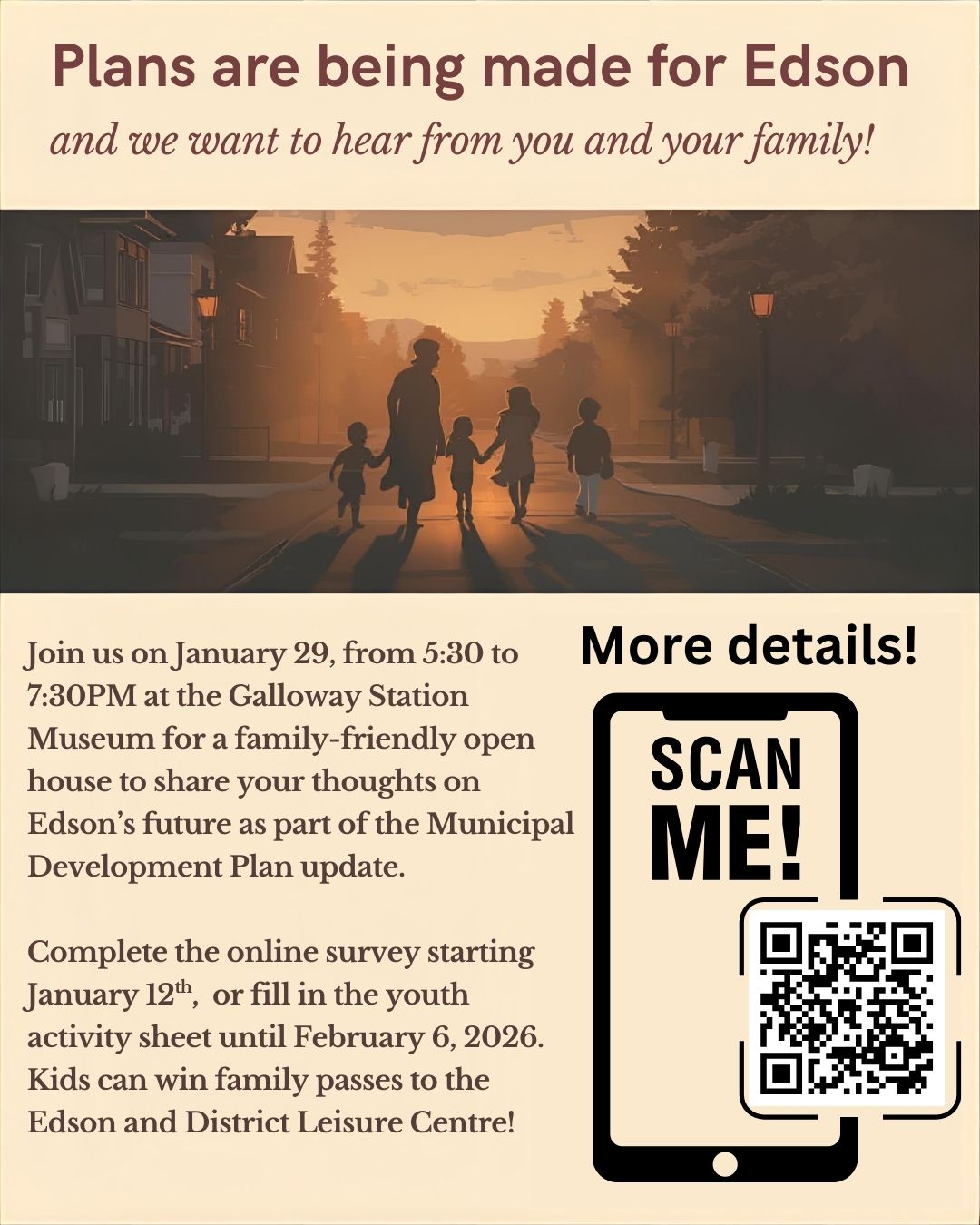 Open House - Join us on January 29, 5:30 to 7:30PM at the Galloway Station Museum for a family-friendly open house to share your thoughts on Edson’s future!